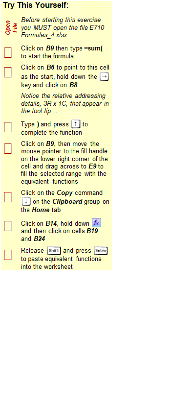 type the function, and then use the pointing technique to fill in the arguments. Excel then paints marquees around the cells involved helping you to track your progress.