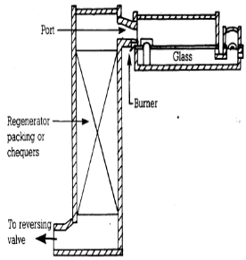 The term regenerative refers to the form of heat recovery system. Burners firing fossil fuels are usually positioned in or below combustion air/waste gas ports. The heat in the waste gases is used to preheat air prior to combustion. This is achieved by passing the waste gases through a chamber containing refractory material, which absorbs the heat. The furnace fires on only one of two sets of burners at any one time. After a predetermined period, usually twenty minutes, the firing cycle of the furnace is reversed and the combustion air is passed through the chamber previously heated by the waste gases. A regenerative furnace has two regenerator chambers, while one chamber is being heated by waste gas from the combustion process, the other is preheating incoming combustion air. Most glass container plants have either end-fired or cross-fired