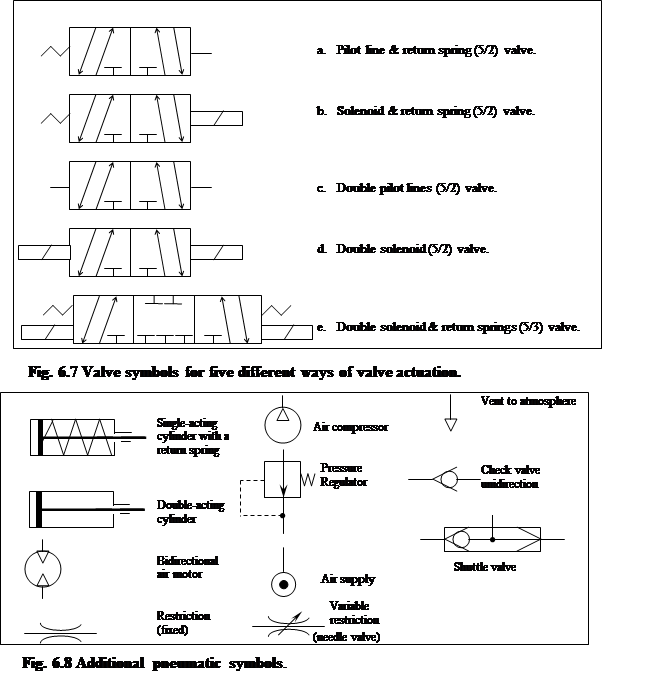 In addition to the rectangles showing the valve positions, the symbol must also indicate how the valve is shifted or actuated. The symbols for common actuation methods shown in Fig. 6.6. As illustrated in Fig 6.6, the actuation symbols are for only one valve position. Actually, the opposite actuation must also exist, because otherwise the valve could never shifted back to its original position. various combination are available. For example, Fig( 6.7a) shows a valve with pilot-pressure actuation and return spring. In Fig 6.7(b, a) solenoid is substituted for the pilot line. Fig 6.7(c & d), no return spring, instead the valve is shifted back by activating the opposite pilot line or solenoid, respectively.