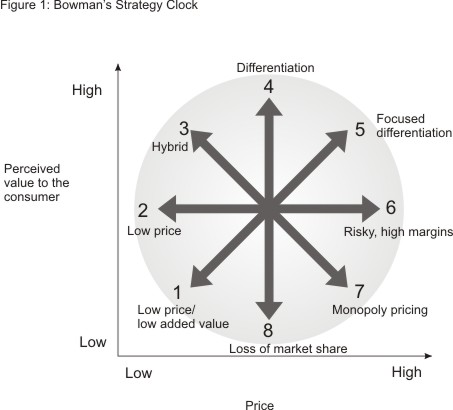 2.1.2 The strategic clock was suggested by Bowman (1996) as a way of looking at combinations of price and perceived benefits. Companies should consider which combination of the two they should try to offer, although to do this they must also understand the perception of customers about the benefits that the product or service provides.